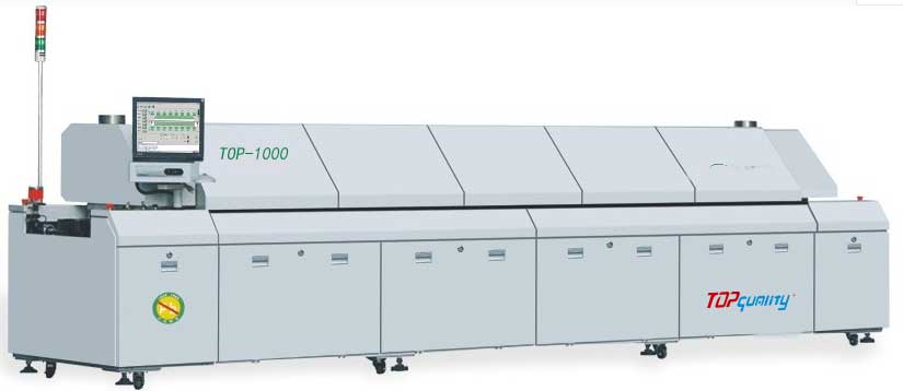 top-1000回流焊是一款高產(chǎn)能,低功耗的高端無鉛微循環(huán)熱風(fēng)回流焊。在表面組裝工藝生產(chǎn)(SMT)中,用于焊接貼片器件的焊接專用生產(chǎn)設(shè)備。